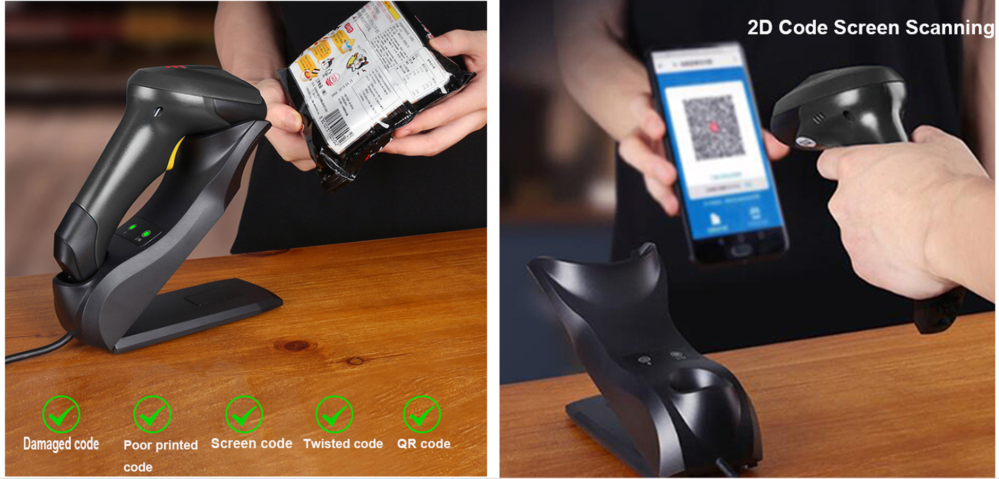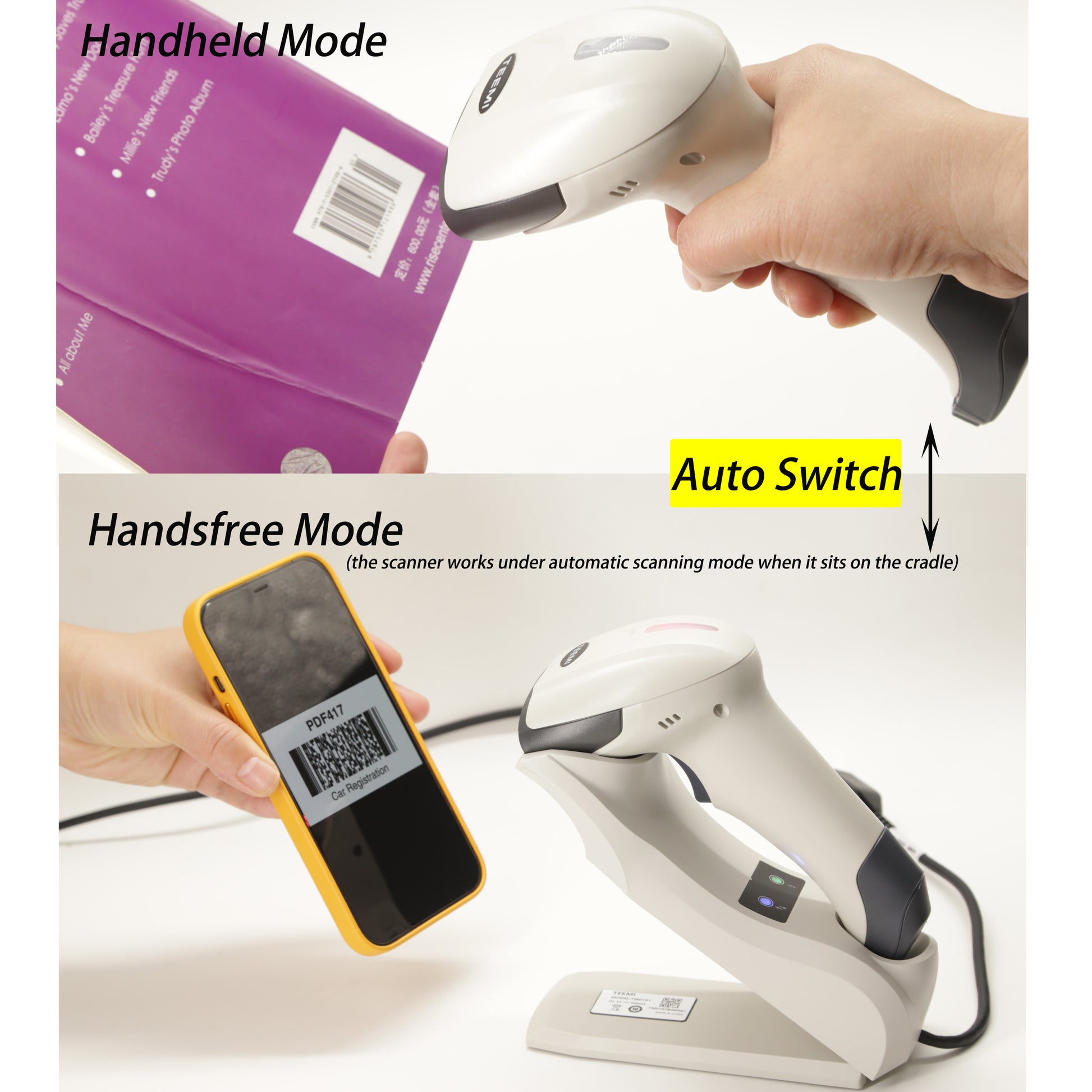 2D Bluetooth Barcode Scanner with Intelligent USB Cradle-Auto Switch between Handsfree and Handheld Mode